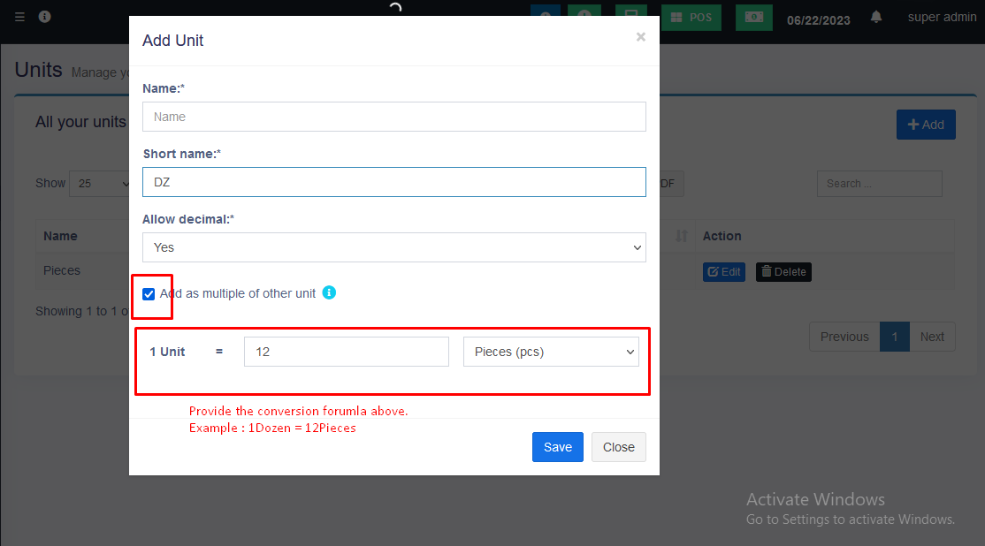 Note - You will not see the main Units (Dozen in this example) in the Add-Product Unit dropdown, select piece as the unit of product. All purchases/sales get saved in the lower unit (pieces in the above example). So after adding purchases/sales if you edit the conversion details, it will affect the purchases/sales quantity accordingly.