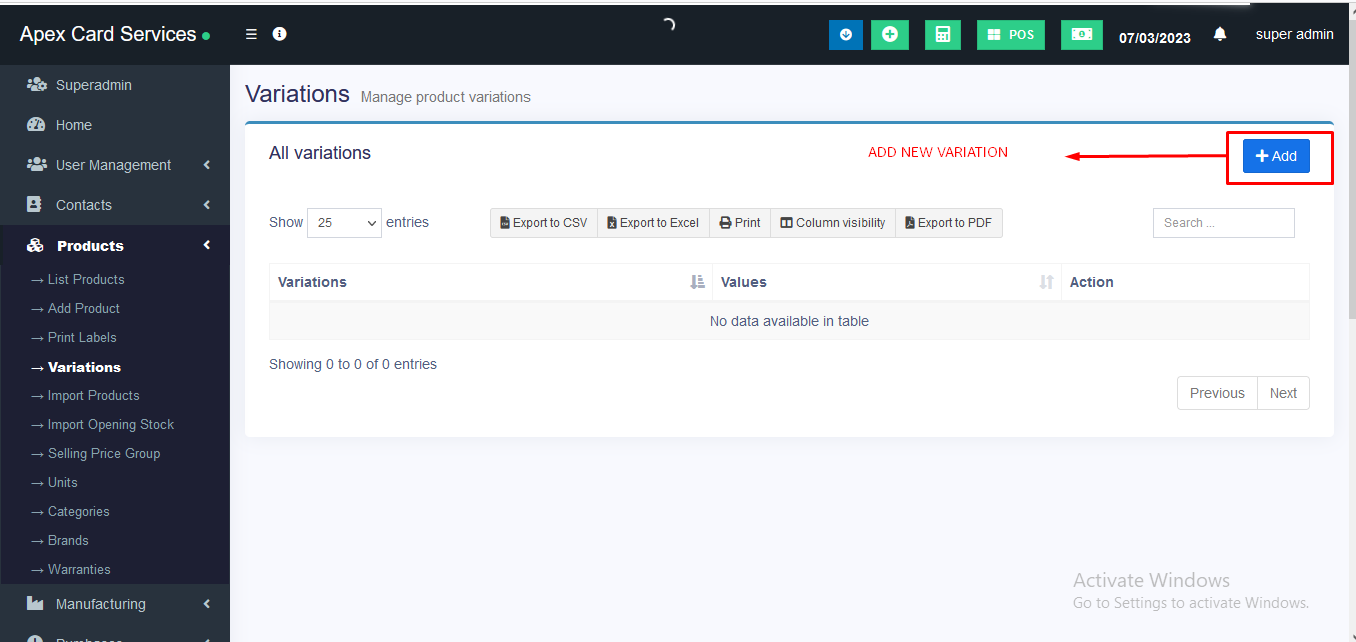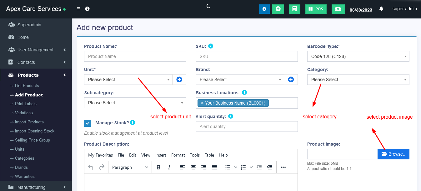 Different Products have different units. Apex Card Service POS allows you to add different units of products: