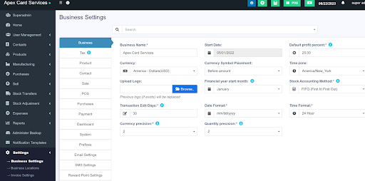 Your Business in the Apex POS System: Name of Business, Currency, Time, Logo, Stock Account, Tax Id, Products, Sale, Purchase, Payments, Email Setting, SMS, Rewards Plus More.