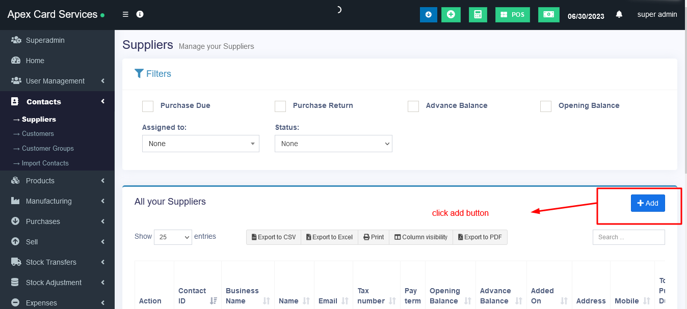 Step 1 GO to Contact ==> Suppliers ==> Add newSelect appropriate dashboard link for contacts